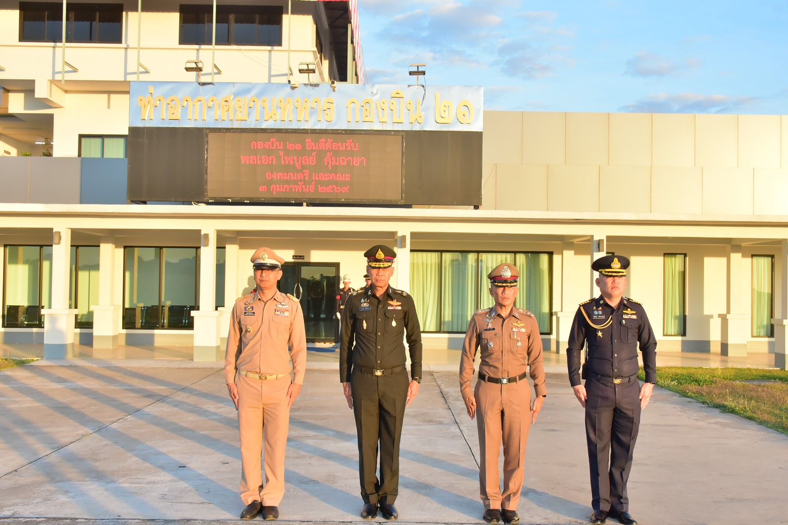 พลเอก ไพบูลย์ คุ้มฉายา องคมนตรี และคณะ เดินทางมาปฏิบัติภารกิจมอบสิ่งของพระราชทานและเยี่ยมให้กำลังใจเจ้าหน้าที่ปฏิบัติงาน และเจ้าหน้าที่ที่ได้รับบาดเจ็บจากสถานการณ์ชายแดนไทย-กัมพูชา ในพื้นที่จังหวัดอุบลราชธานี ในการนี้ นาวาอากาศเอก ชัยภัสร์ เตียตระกูล เสนาธิการกองบิน ๒๑ ให้การต้อนรับ ณ ท่าอากาศยานทหาร กองบิน ๒๑ เมื่อวันที่ ๓ กุมภาพันธ์ ๒๕๖๙