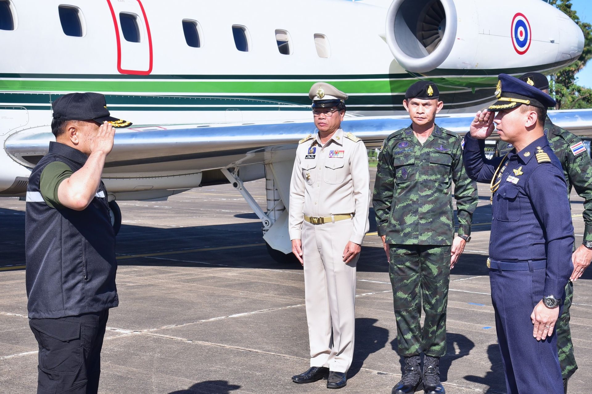 นาวาอากาศเอก บุรานนท์ นนคลัง รองผู้บังคับการกองบิน ๒๑ ให้การต้อนรับ พลเอก ณัฐพล นาคพาณิชย์ รัฐมนตรีว่าการกระทรวงกลาโหม พร้อมคณะ ในโอกาสเดินทางไปปฏิบัติภารกิจตรวจเยี่ยมชายแดนไทย-กัมพูชา ณ ลานจอดแผนกช่างอากาศ กองบิน ๒๑ จังหวัดอุบลราชธานี เมื่อวันศุกร์ที่ ๑๐ ตุลาคม ๒๕๖๘