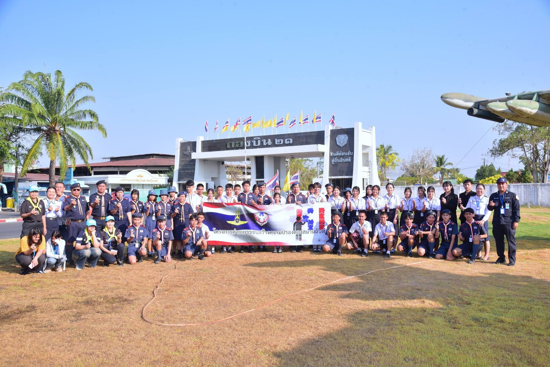 นาวาอากาศเอก ภักตร์ บุณยะเวศ ผู้บังคับการกองบิน ๒๑ มอบหมายให้แผนกกิจการพลเรือน กองบิน ๒๑ จัดกิจกรรมโครงการค่ายเยาวชนสร้างความปรองดองสมานฉันท์ เพื่อสร้างความเข้าใจกันของคนในชาติและลดความขัดแย้งระหว่างกลุ่มคนให้อยู่ร่วมกันอย่างมีความสุข ระหว่างวันที่ ๒๑ - ๒๒ กุมภาพันธ์ ๒๕๖๙ โดยนำตัวแทนเยาวชนจากโรงเรียนราชประชานุเคราะห์ ๓๒ และโรงเรียนปทุมวิทยากร เข้าร่วมโครงการฯ โดยกิจกรรมประกอบด้วยการเยี่ยมชมแหล่งเรียนรู้สืบสานภูมิปัญญาชาวบ้าน กิจกรรมจิตอาสาพัฒนาทำความสะอาดลานวัดบุ่งขี้เหล็ก(ลานพระขาว) กิจกรรมกลุ่มสัมพันธ์การรับฟังบรรยายโทษพิษภัยของยาเสพติด และการรับฟังการบรรยายภารกิจของหน่วยเรือรักษาความสงบเรียบร้อยตามลำแม่น้ำโขง เขตอุบลราชธานี พร้อมศึกษาภูมิประเทศตามลุ่มแม่น้ำโขง อำเภอเขมราฐ จังหวัดอุบลราชธานี